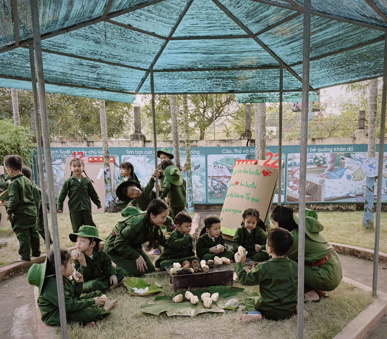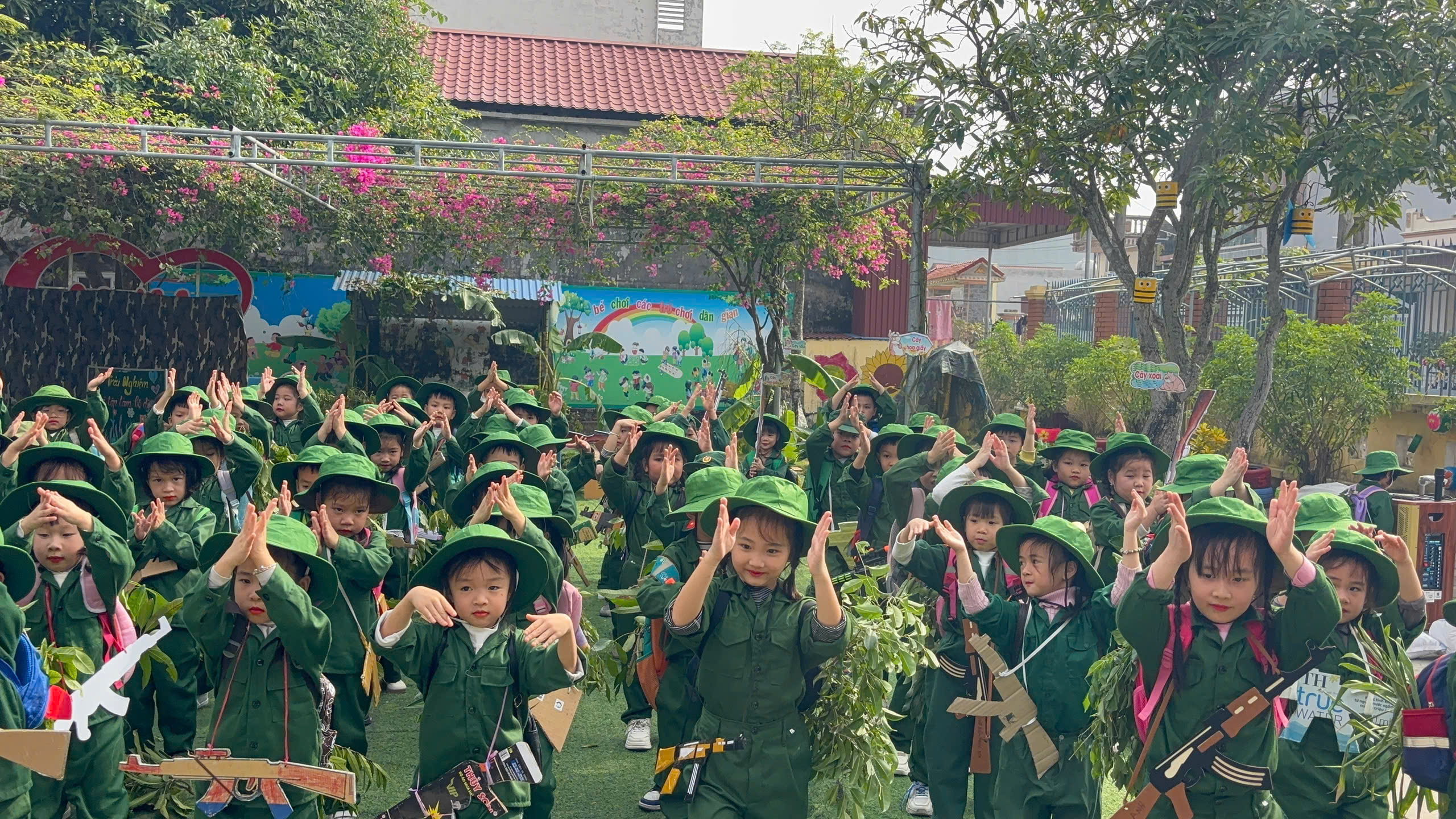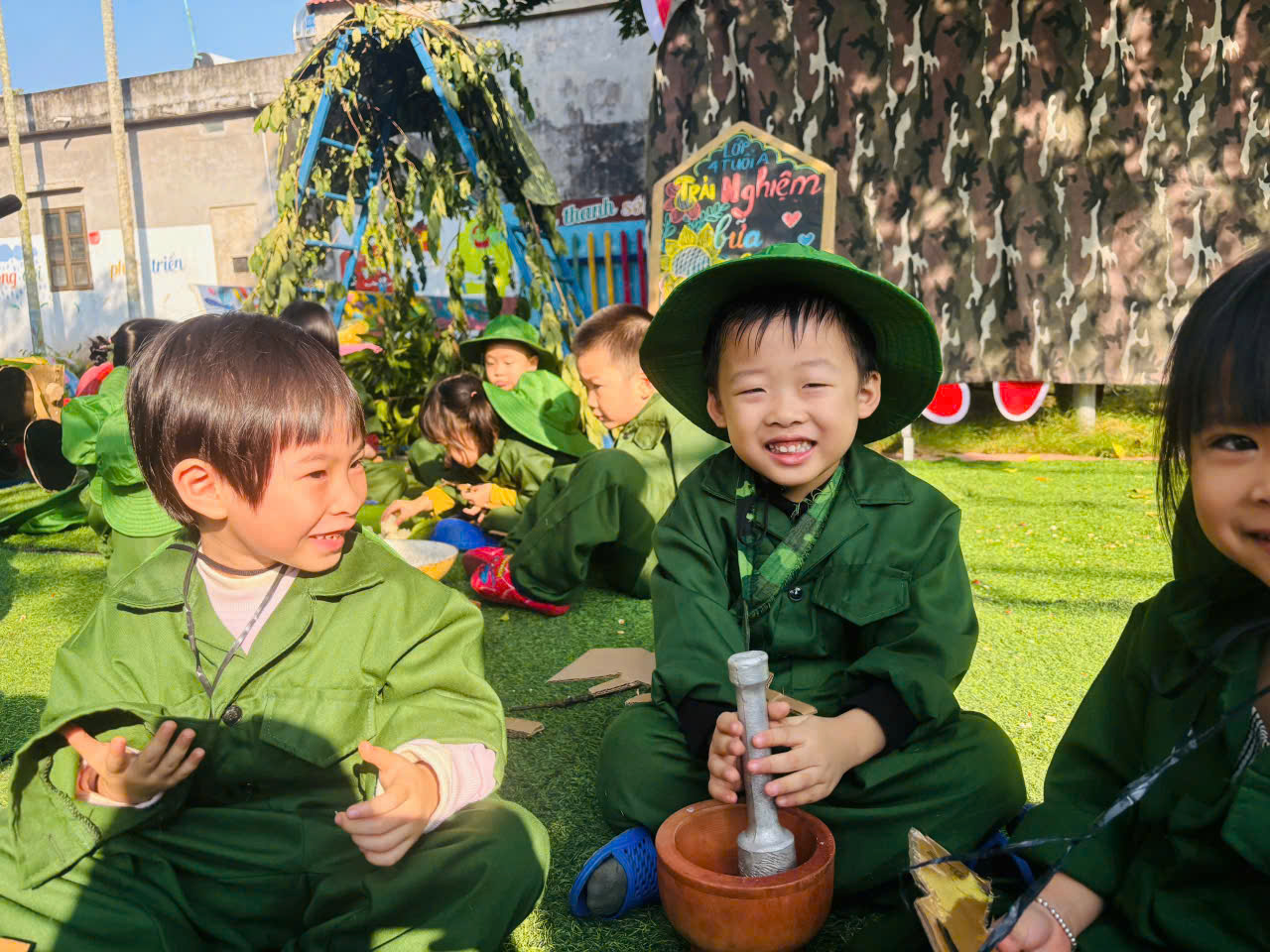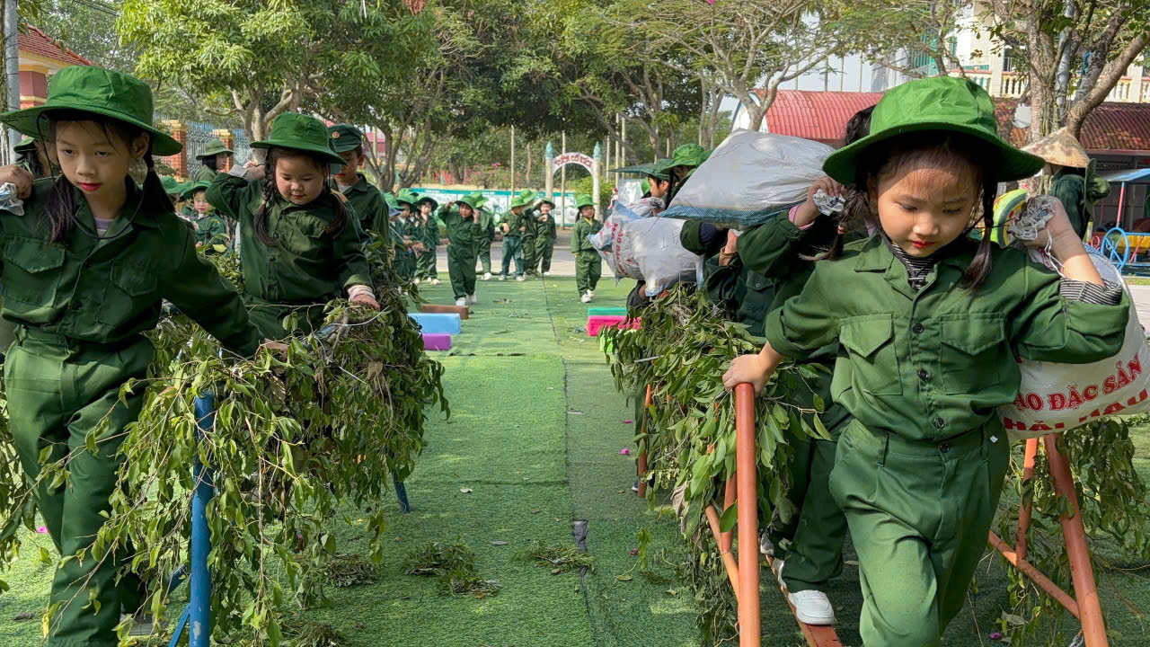 Bên cạnh đó, nhà trường còn tổ chức cho trẻ trải nghiệm “Bữa cơm lạc vừng trong rừng”, tái hiện một phần cuộc sống giản dị, gian khó nhưng giàu tình đồng đội của các chú bộ đội trong những năm tháng chiến đấu bảo vệ Tổ quốc. Thông qua hoạt động này, trẻ được giáo dục về tinh thần tiết kiệm, biết trân trọng giá trị của lao động, của hòa bình và cuộc sống hôm nay.