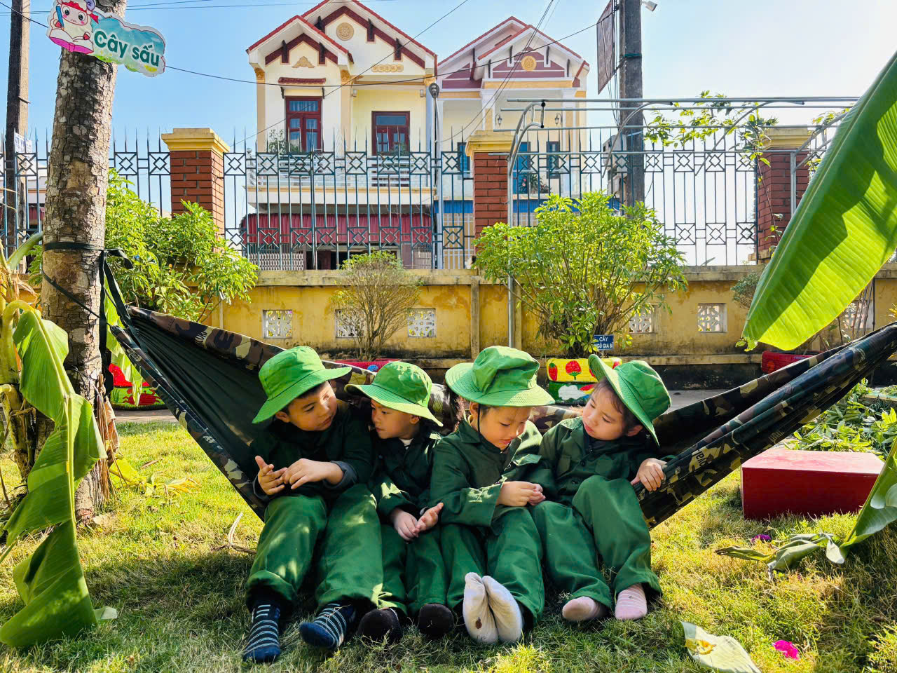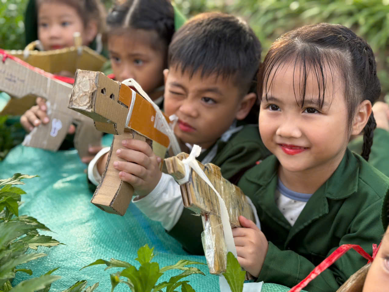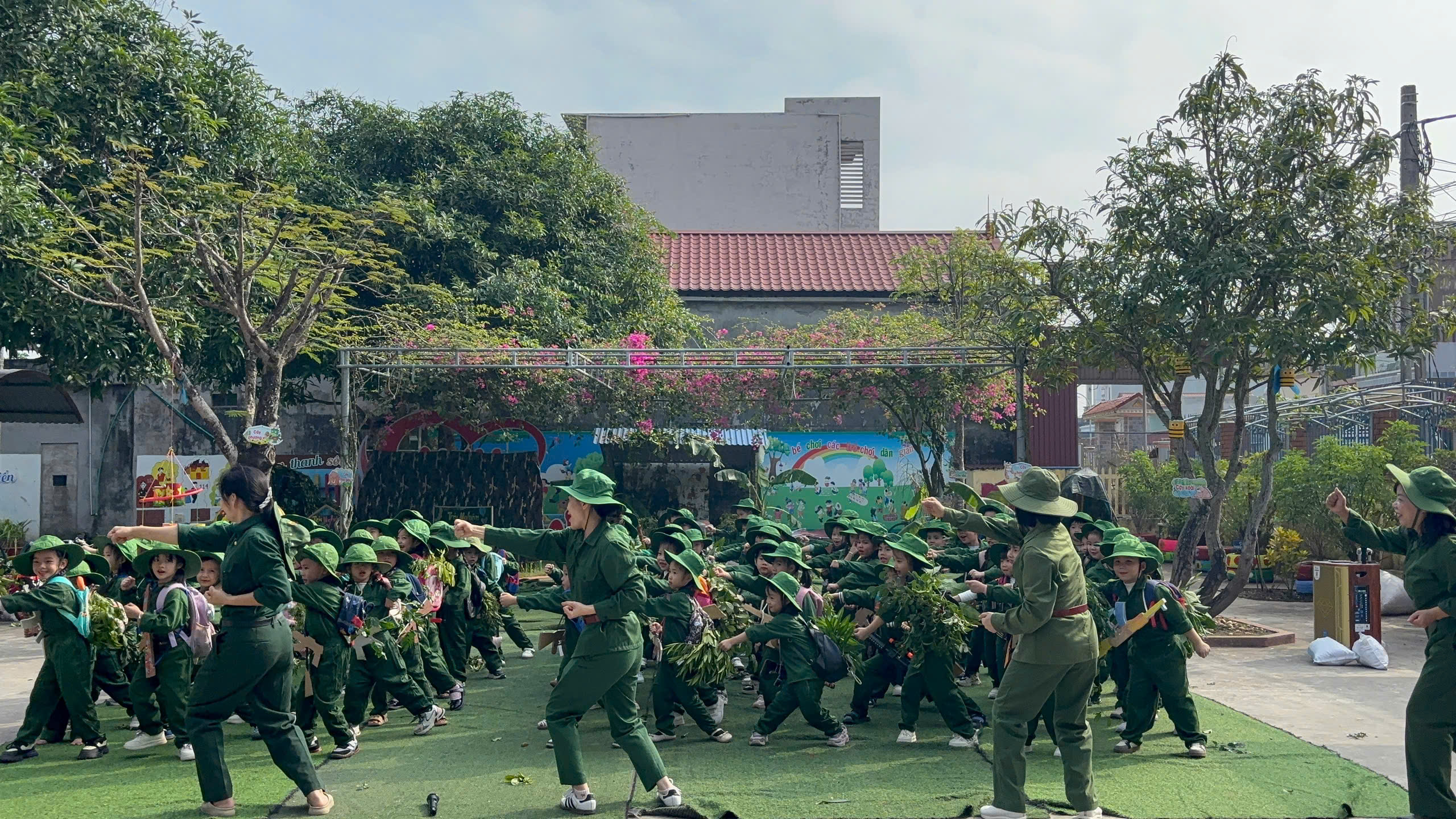 Bên cạnh đó, nhà trường còn tổ chức cho trẻ trải nghiệm “Bữa cơm lạc vừng trong rừng”, tái hiện một phần cuộc sống giản dị, gian khó nhưng giàu tình đồng đội của các chú bộ đội trong những năm tháng chiến đấu bảo vệ Tổ quốc. Thông qua hoạt động này, trẻ được giáo dục về tinh thần tiết kiệm, biết trân trọng giá trị của lao động, của hòa bình và cuộc sống hôm nay.