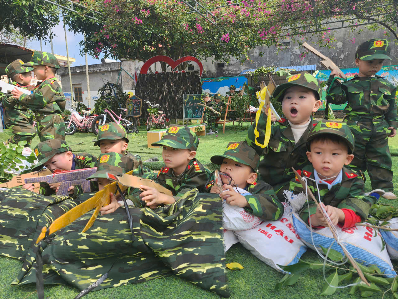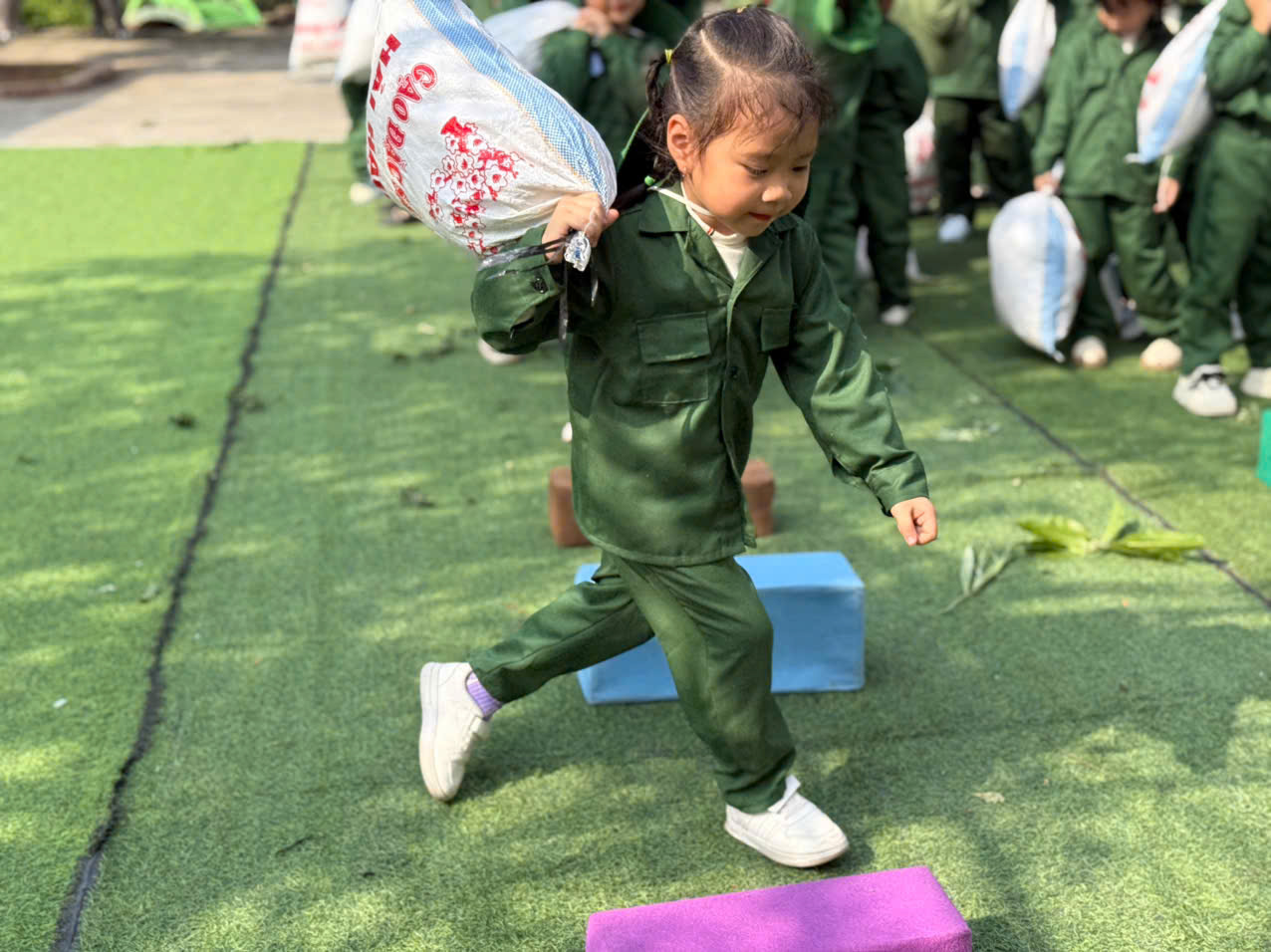 Nổi bật trong chuỗi hoạt động là chương trình trải nghiệm “Bé tập làm chú bộ đội” được tổ chức cho trẻ các khối lớp tham gia. Trong không gian được thiết kế sinh động, gần gũi, các bé đã được hóa thân thành những “chiến sĩ nhí”, tham gia nhiều hoạt động rèn luyện thể chất và kỹ năng như: diễu hành đội ngũ, diễn tập bò – trườn – chui qua hầm, vượt chướng ngại vật, tập bắn, tập cứu thương, vượt qua các chướng ngại vật để vận chuyển lương thực tới cho các chú bộ đội,… Các hoạt động không chỉ tạo không khí vui tươi, hào hứng mà còn giúp trẻ rèn luyện sự khéo léo, bền bỉ, tinh thần kỷ luật và ý thức tập thể.