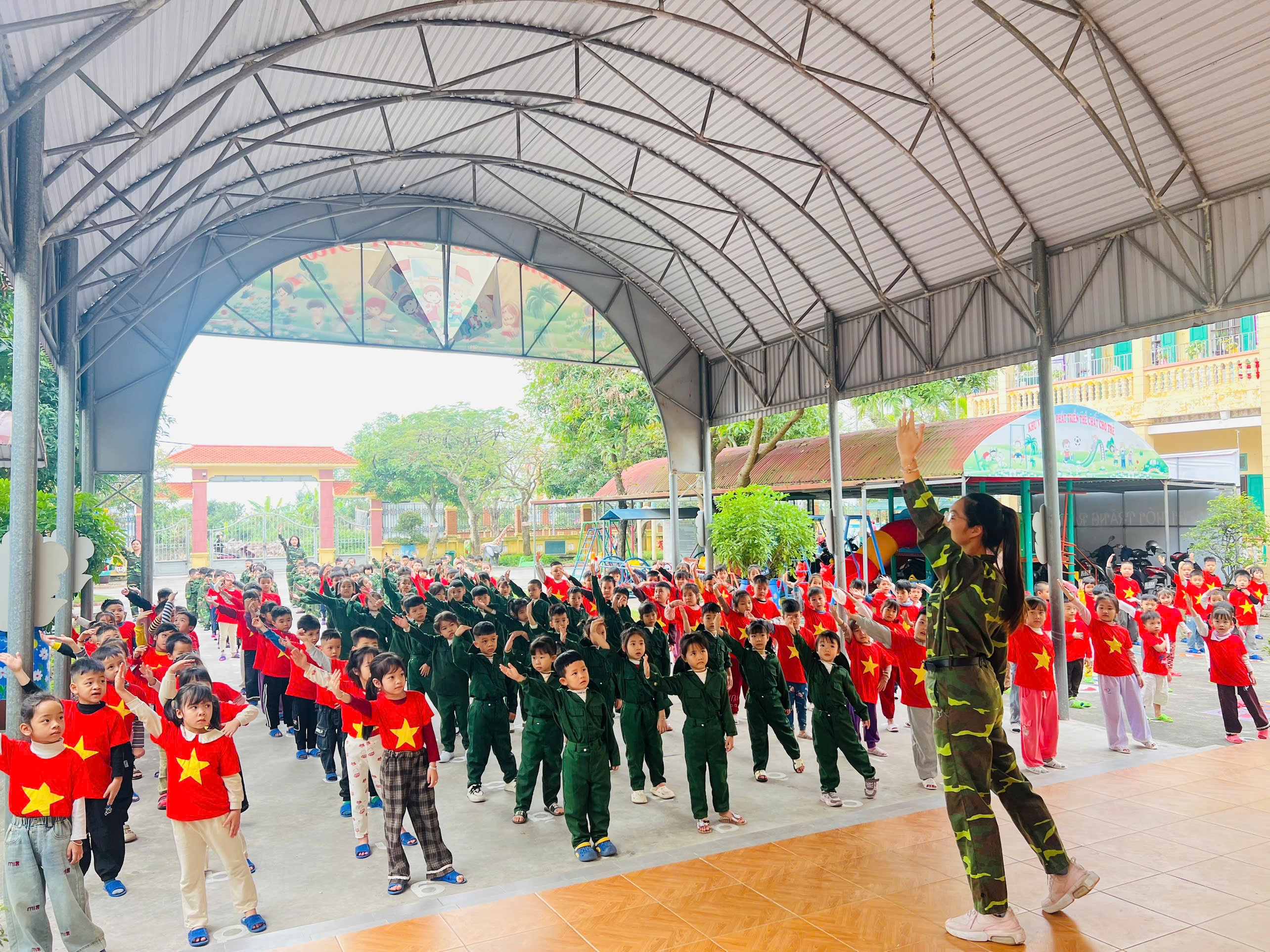 Điểm nhấn của chuỗi hoạt động là màn đồng diễn tập thể của toàn trường với tiết mục ca ngợi Tổ quốc Việt Nam. Trong những giai điệu hào hùng, thiêng liêng, các bé đã cùng nhau thể hiện những động tác khỏe khoắn, đồng đều, thể hiện tình yêu quê hương, đất nước, niềm tự hào về truyền thống cách mạng vẻ vang của dân tộc Việt Nam.